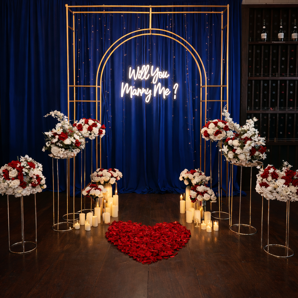 Luxury proposal setups in Chicago, including romantic “Marry Me” backdrops, candles, roses, balloon installations, and custom engagement decor designed to surprise and celebrate life’s most special moment.