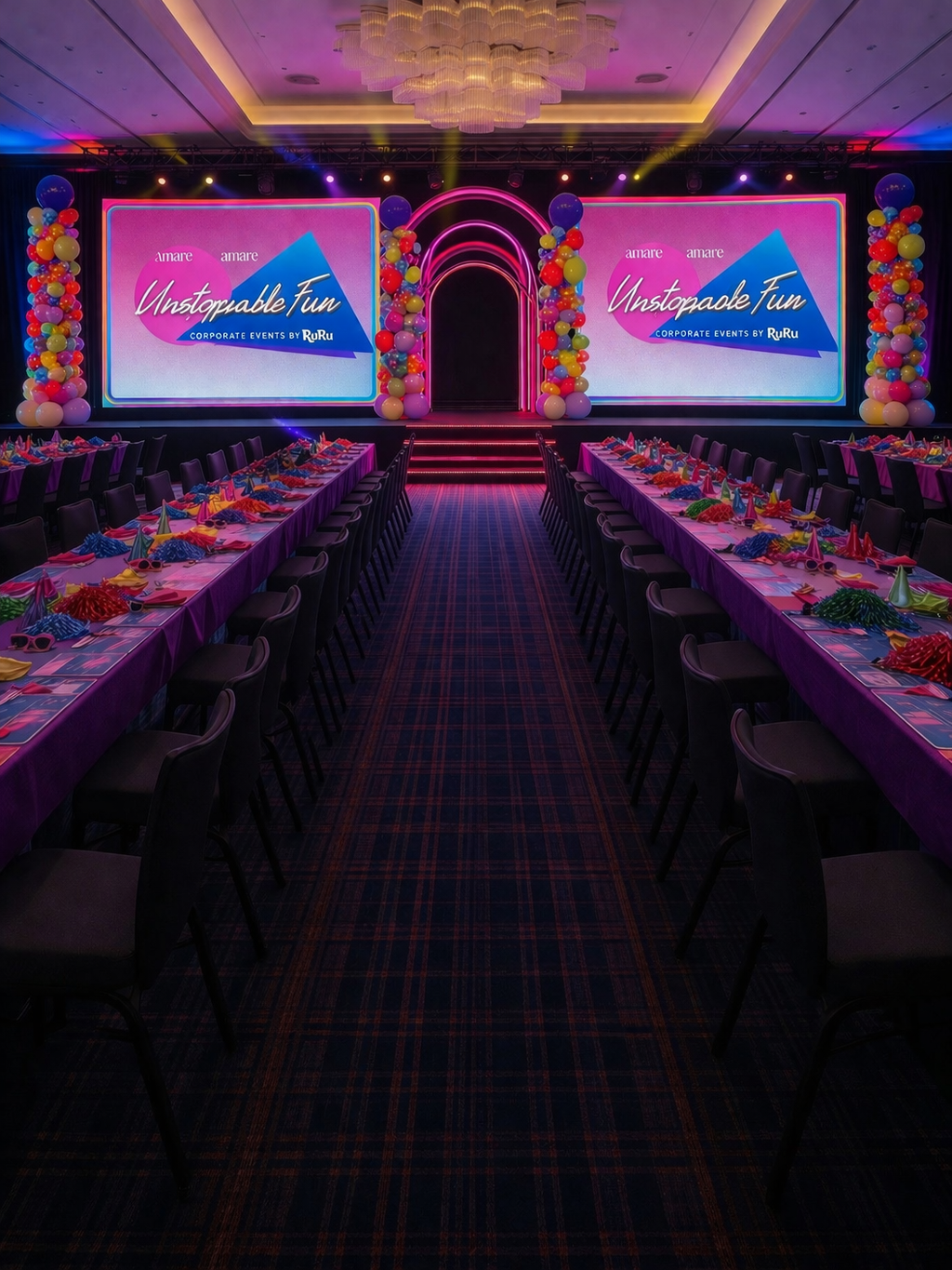 Professional corporate event decor, including branded backdrops, stage setups, table decor, and elegant event styling for business gatherings, company celebrations, and brand activation.