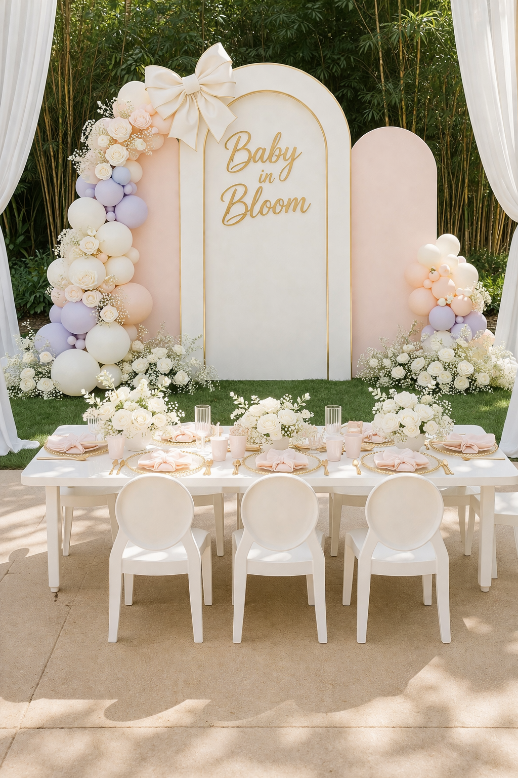 Beautiful baby shower decor featuring balloon garlands, themed backdrops, elegant table styling, and personalized event design for welcoming new arrivals.